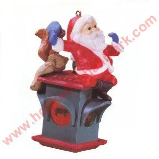Santa Claus and a squirrel are perched atop a four-way signal light which illuminates an animal.