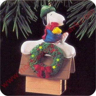 Lights blink merrily on the wreath on Snoopy’s Roof.