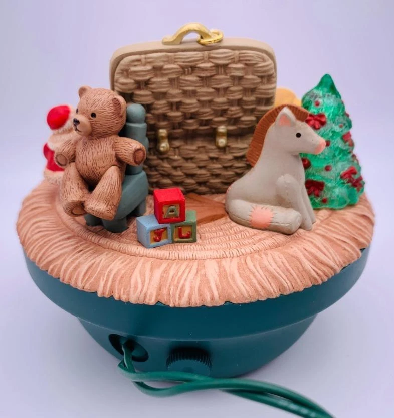 The Christmas tree glows, jack-in-the-box goes up and down, top spins and Santa wobbles.