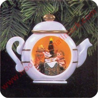 Light inside teapot illuminates a doll and teddy bear’s Christmas party