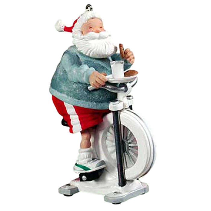 To set the ornament in motion, turn the knob on the side of the ornament. Santa’s legs will begin to pedal, and his arm will bring the cookie to his mouth for another bite!