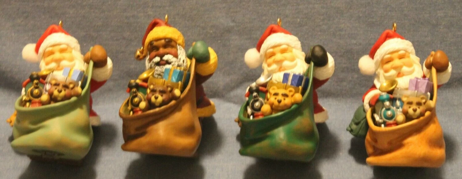 There are four different versions of the ornament Santa’s Magic Sack. 2005 Santa’s Magic LIGHT GREEN Sack – Original Version 2005 Santa’s Magic BROWN Sack – AFRO-AMERICAN SANTA Version 2005 Santa’s Magic DARK GREEN Sack – October Register to Win Repaint 2005 Santa’s Magic TAN Sack – Exclusive VIP Customer Gift The gift and toys inside the sack are also different colors on the different versions |