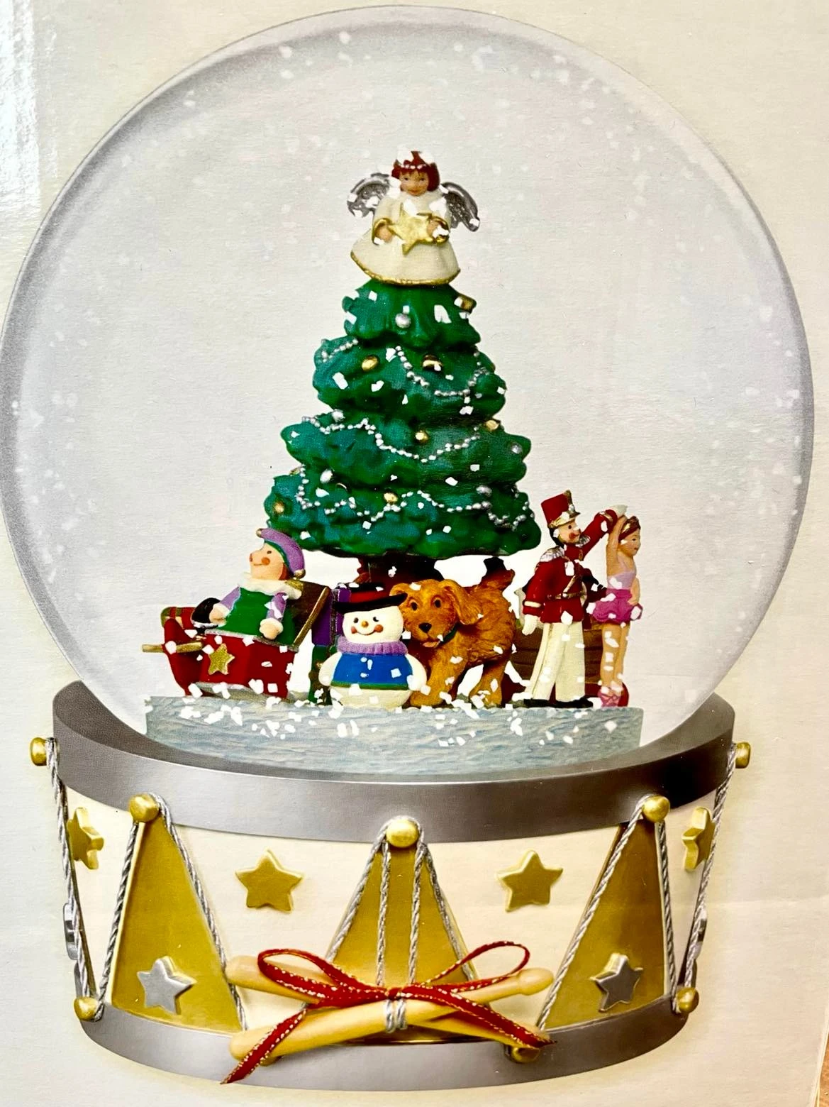 Turn the key on the snowglobe to see The tree with toys on top of the drum base rotate INSIDE the globe as the music box plays “O Tannebaum”
