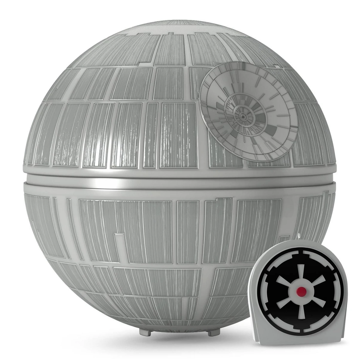 Press the button on the remote control to see the Death Star Tree Topper illuminate and hear the Star Wars: Main Title and The Imperial March.