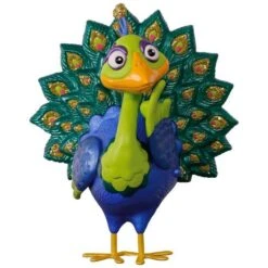 With brilliant green, red and gold feathers on display, this prettypeacock is proudly showing off her true colors. Press the button on this
