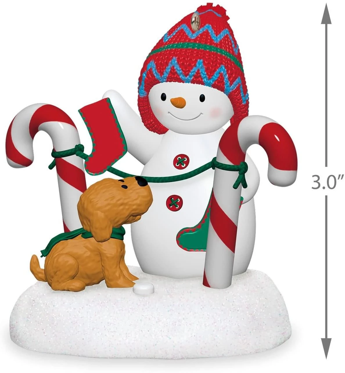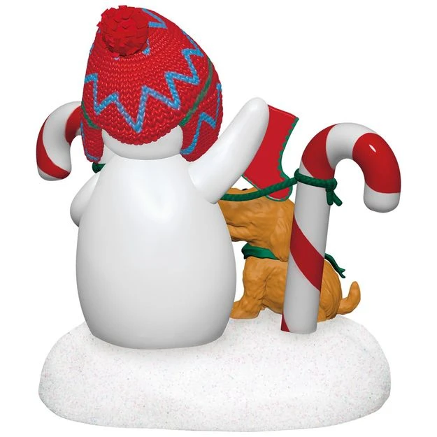 featuring a snowman decked out in a winter cap, with a plush brown puppy
