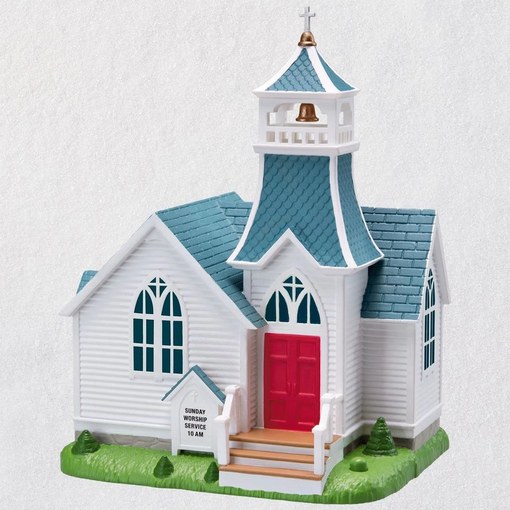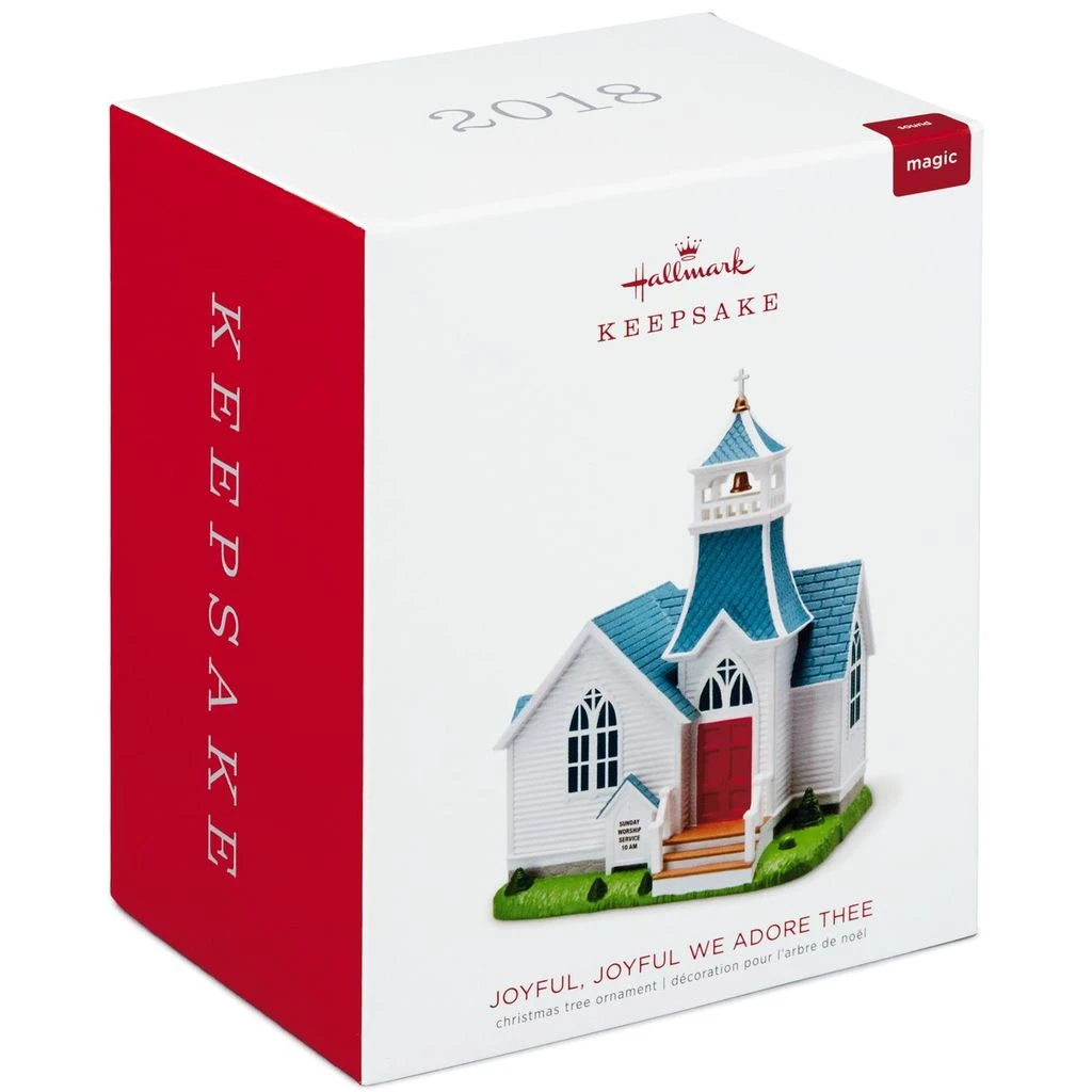 Condition: New, Mint Ornament in Mint Box A charming blue-roofed country church with a red door and “Sunday Worship” sign out front. Press the button on the ornament to hear a gospel choir sing music from “Joyful, Joyful We Adore Thee.” Battery-operated sound feature includes two replaceable LR44 batteries.