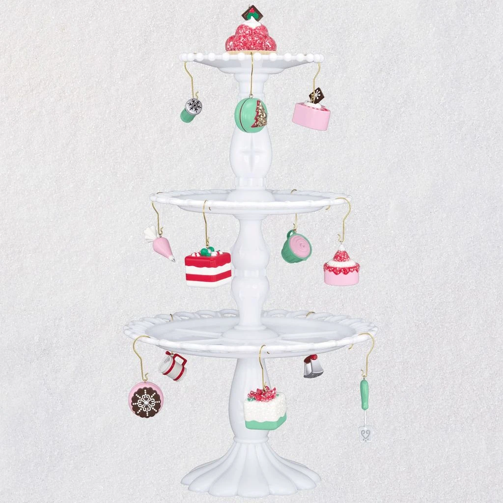 Make the holidays even sweeter with this fun set that includes a miniature Christmas “tree” that’s designed to look like stacked cake stands. For the perfect finishing touch, it includes a dozen miniature Christmas tree ornaments that fit the cute kitchen theme. Plus, the cake stand design is perfect for displaying your collection of Christmas Cupcakes series ornaments (sold separately)!