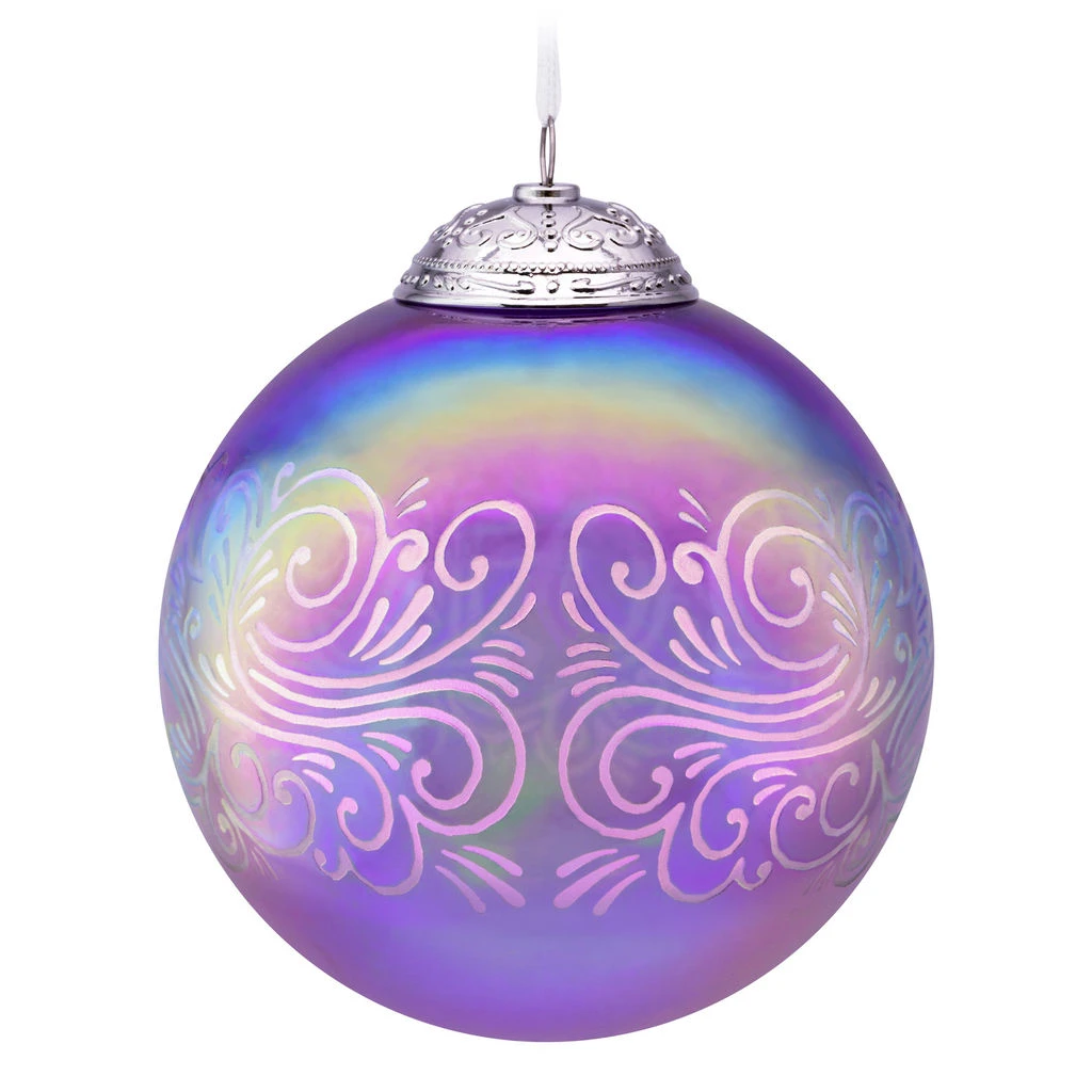Remember the bright moments and joys that this year has brought to you and your family with this 2019 commemorative Christmas tree ornament. 7th in the series, this translucent glass ball with a regal purple hue features an intricate scroll pattern in white around the date and an embossed metal cap.