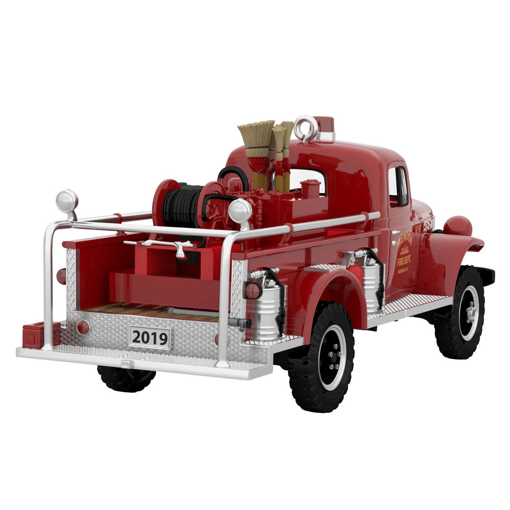 Add a touch of nostalgia to your holidays with this bright red Christmas tree ornament featuring a rugged 1958 Dodge Power Wagon Fire Engine. Inspired by a real fire truck owned by the Mendon, New York, Fire Department, it features wheels that turn and authentic details that are sure to make it an instant favorite with firefighters and classic car enthusiasts. The fire engine’s lights illuminate at the touch of a button (battery-operated). 17th in the Fire Brigade series.