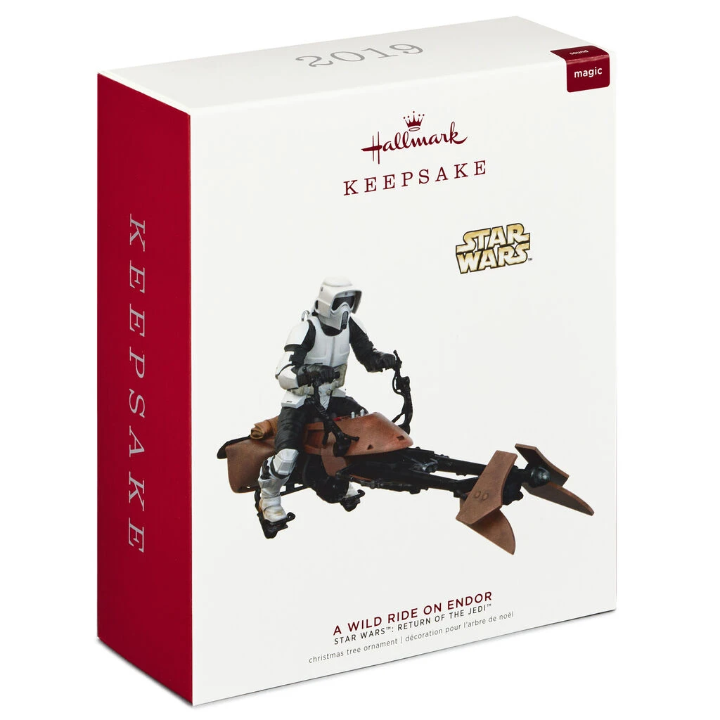 Relive the excitement of one of the most action-packed scenes from Star Wars: Return of the Jedi with this Christmas tree ornament. Featuring an Imperial Scout Trooper aboard his Aratech 74-Z speeder bike, it plays sound clips from the perilous high-speed chase through the forest moon of Endor (battery-operated).