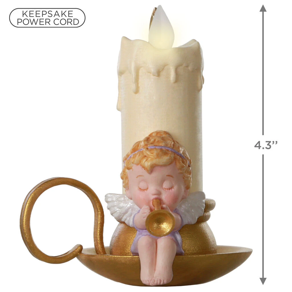 Hark, this herald angel has found a cozy nook to rest in as she awaits her cue. Our cute cherub Christmas tree ornament features a sweet little angel holding a trumpet while sitting in the well of a candlestick holder. The candle illuminates with a realistic flickering flame motion when connected to Hallmark’s Keepsake Power Cord (sold separately).