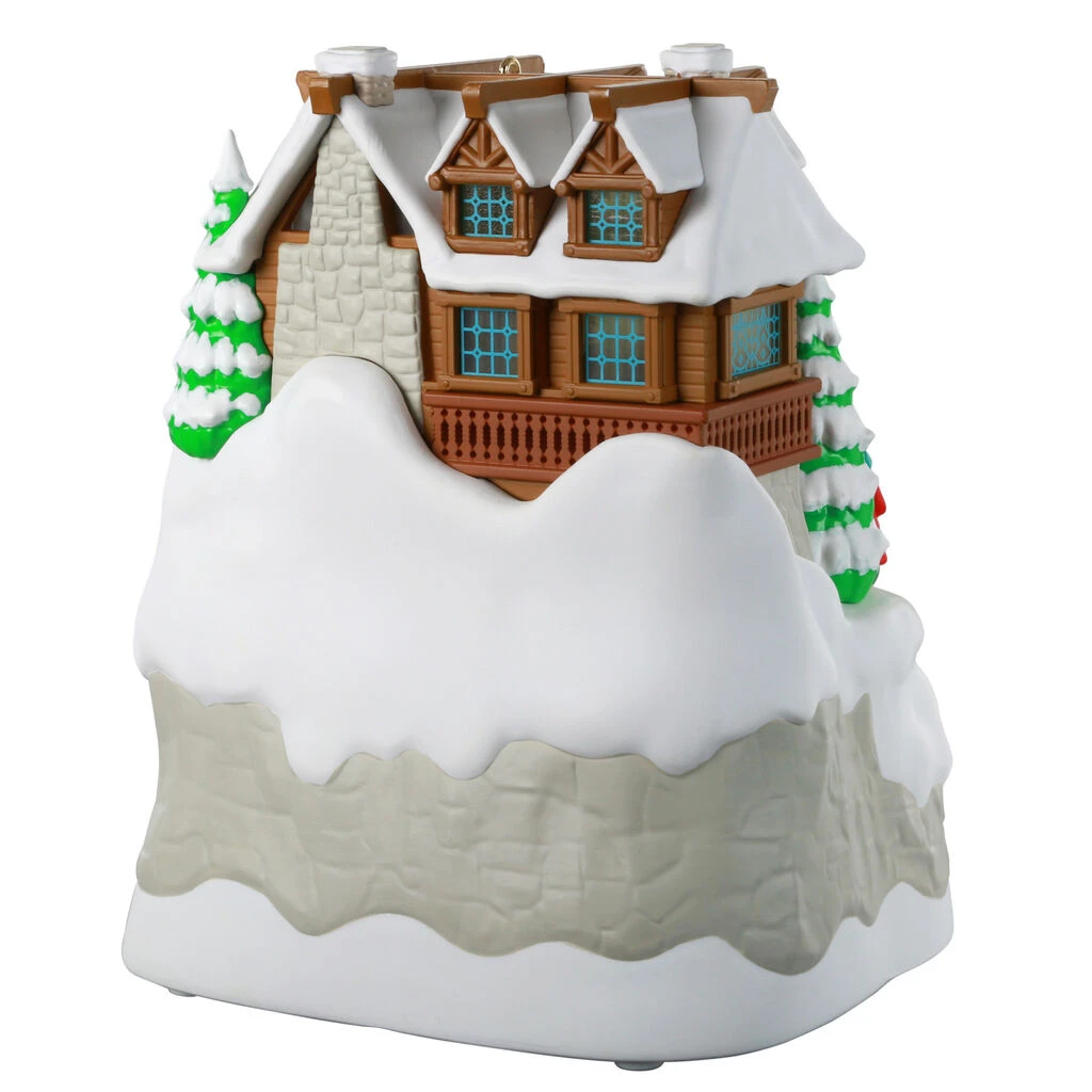 Take your holiday fun to the slopes with this Christmas Cabin ornament. Friends and family will delight in the sounds, lights and moving elements of this Christmas tree ornament that features a ski lodge full of bustling activity. Press the button to see happy scenes come to life: the lodge illuminates as a family adds an ornament to the tree, children sled down a hill and ice skate on a pond, and carolers sing at the front door. The delightful decoration plays a medley of Christmas carols along with singing and speaking voices and the sound of a dog happily barking (battery-operated).