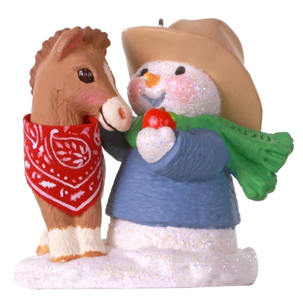 Bask in the warmth of friendship with this year’s Snow Buddies Christmas tree ornament. Featuring a glittery snowman dressed in a cowboy hat ready to give his pony friend a delicious red apple, this decoration is all about sharing fun moments (and yummy treats!) with good friends. A fabric bandanna around the pony’s neck adds a sweet touch.