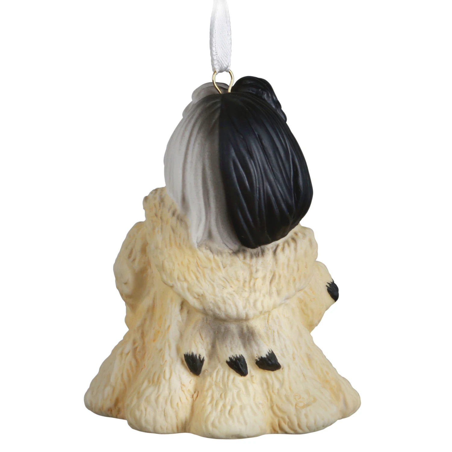 Fans of one of Disney’s most menacing villains will take a sudden chill—of delight—when they hang this premium porcelain Christmas tree ornament. Signature styling gives Cruella De Vil a classic Precious Moments look in this frightfully delightful decoration of the puppy-napping scoundrel with her trademark black and white hair and spotted fur coat.