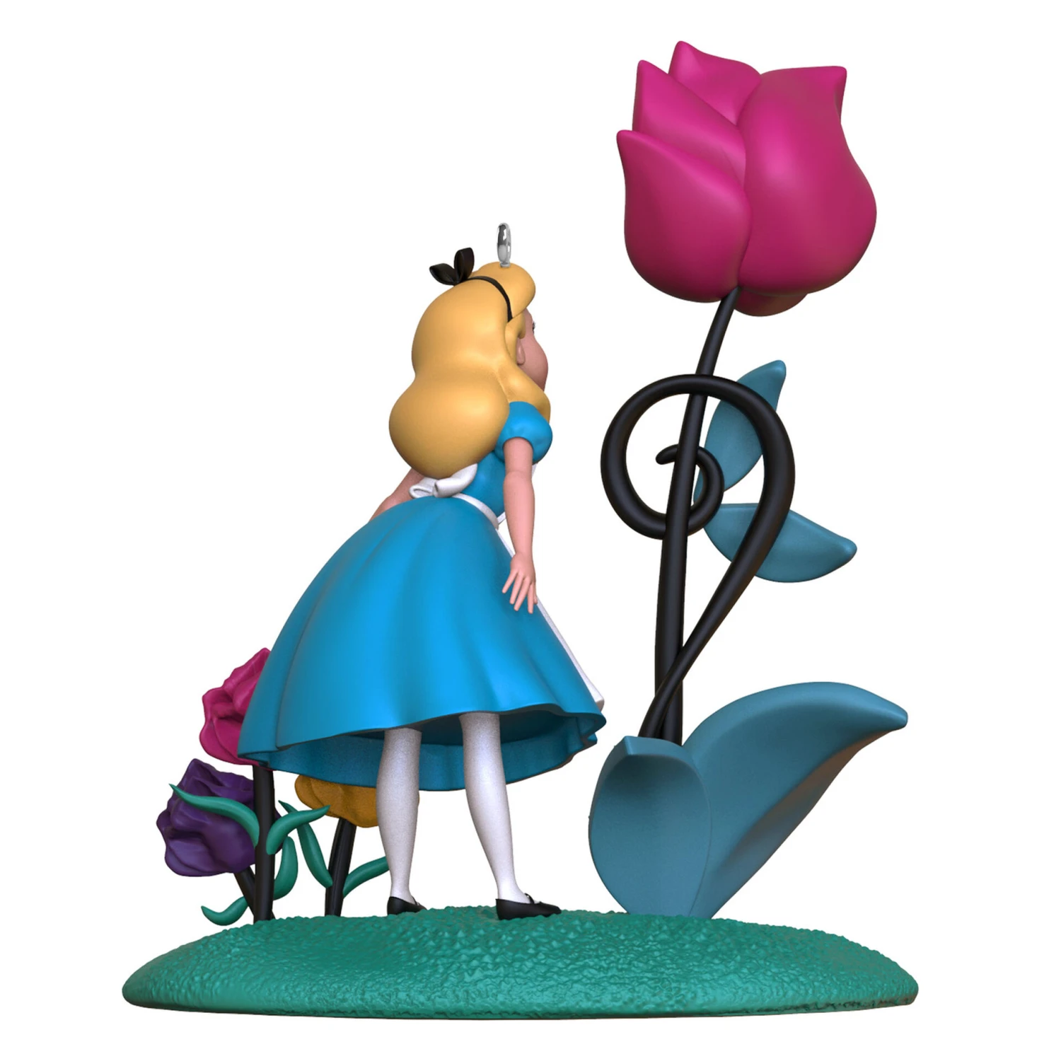 Commemorate the 70th anniversary of the imaginative classic Disney movie “Alice in Wonderland” with this cheerful Christmas tree ornament. The colorful decoration spotlights one of Alice’s many adventures as she encounters a garden of aloof animated flowers.