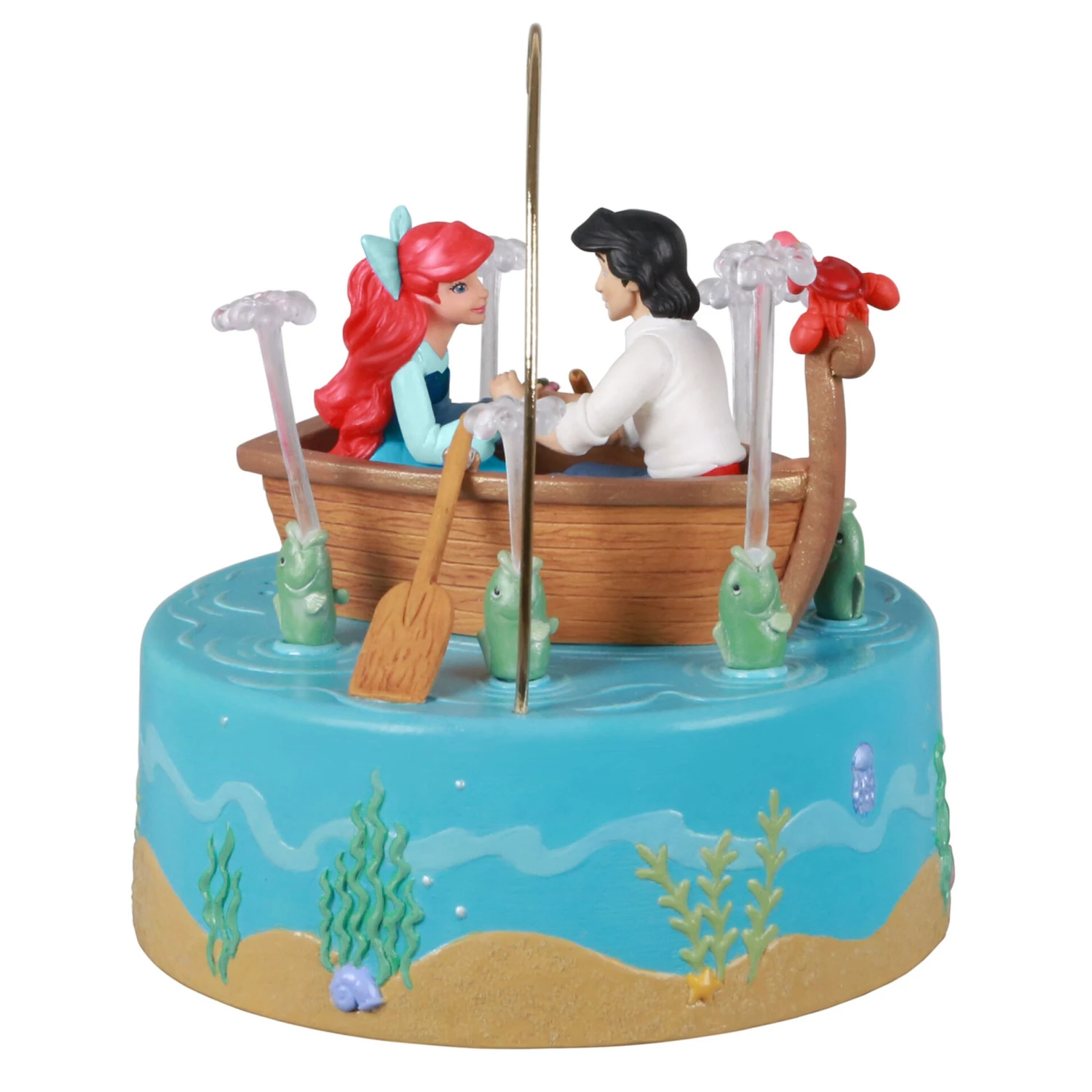 Set the mood for a romantic holiday with a little help from Sebastian and his musical friends under the sea. Capturing the iconic scene when Ariel hopes Prince Eric will break Ursula’s spell with his kiss, this charming Christmas tree ornament features fish that move and plays an excerpt of the song “Kiss the Girl” from the beloved Disney movie “The Little Mermaid” (battery-operated).