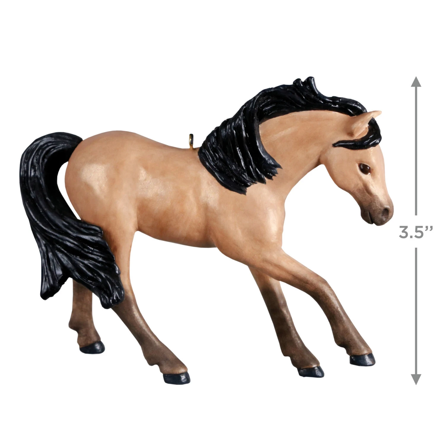 - With its distinctive tan colored coat and black mane, tail and lower legs, the Buckskin horse is beloved among horse-lovers of all ages. Celebrate the handsome bay horse with this Christmas tree ornament. A perfect gift for horseback riders and equestrian enthusiasts of all ages, it features a subtle pearlized finish.
