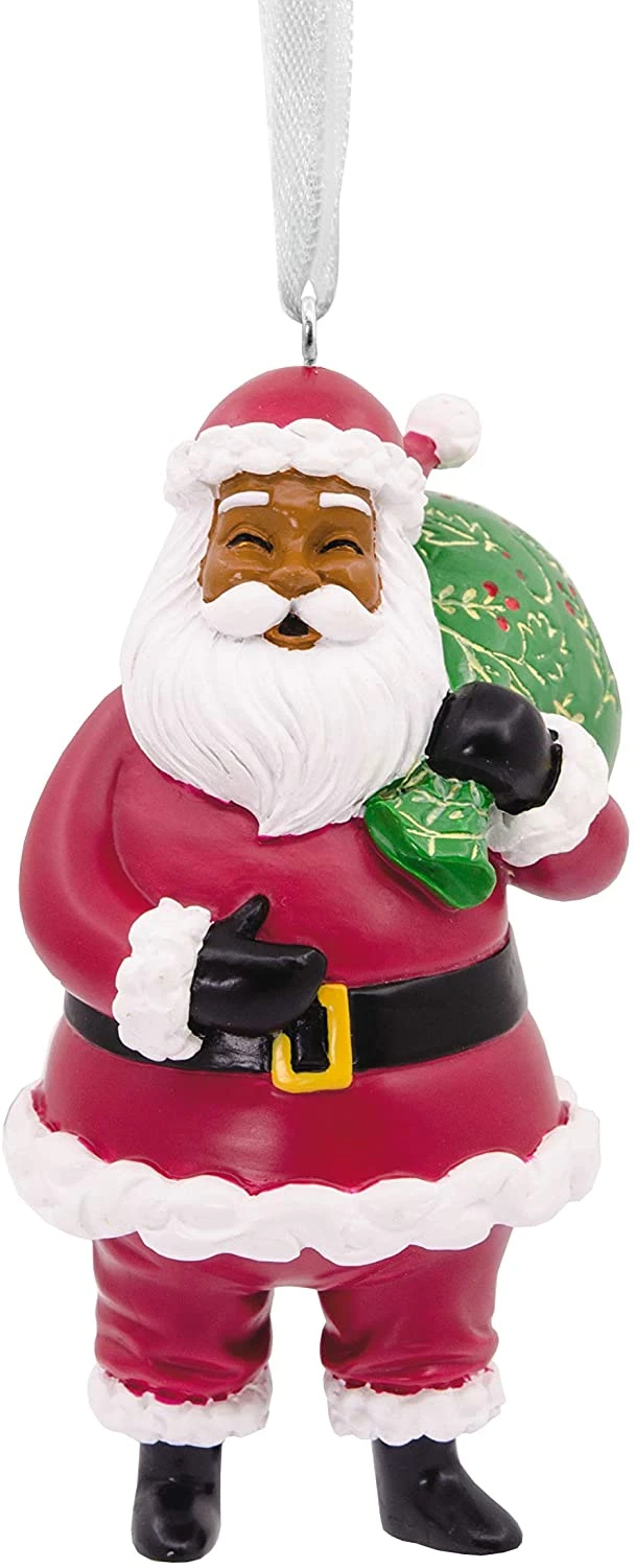 - Put a smile on every face when you display this African-American Santa Claus ornament. The classic design of the jolly old elf will bring a festive feel to your Christmas tree.