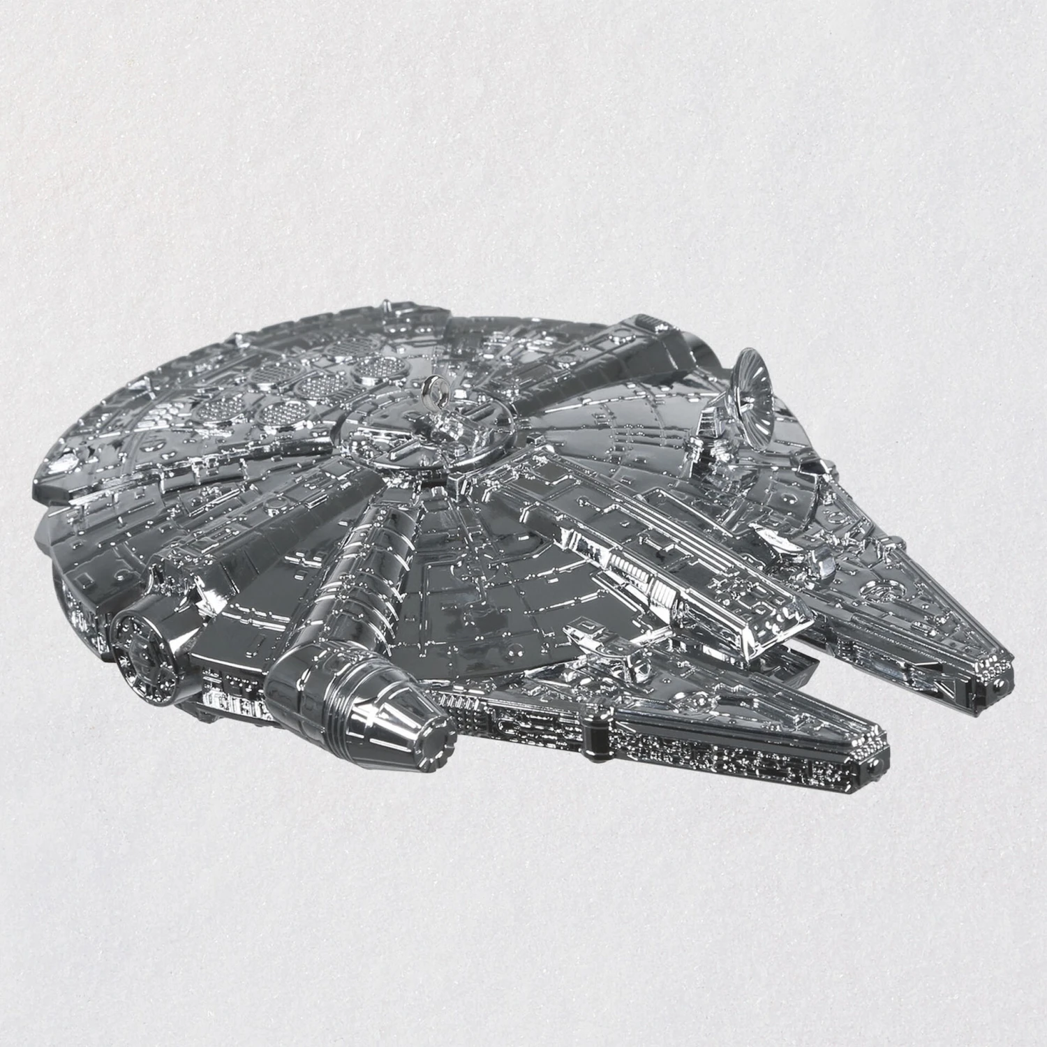 In 1996, Hallmark debuted its very first Star Wars Keepsake Ornament. Celebrate the silver anniversary of that milestone release with this premium metal Christmas tree ornament of Han Solo’s iconic Corellian freighter, the Millennium Falcon, complete with a fabulous shiny chrome finish.