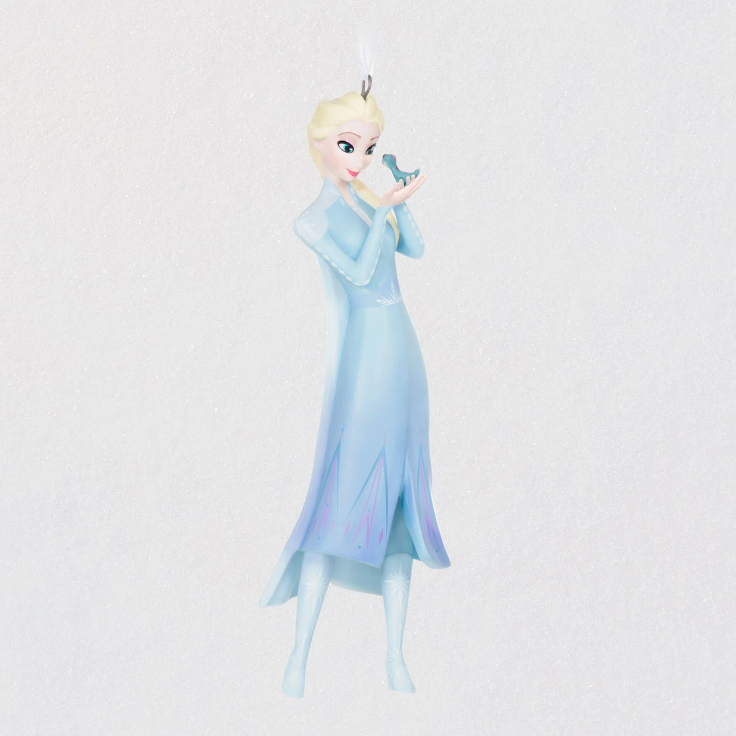 Venture into the Enchanted Forest with Elsa. This premium porcelain Christmas tree ornament features Elsa holding Bruni, the elemental fire spirit in the form of a little salamander with big blue eyes. Fans of “Frozen 2” will love this design that beautifully captures the bond between the magical characters.