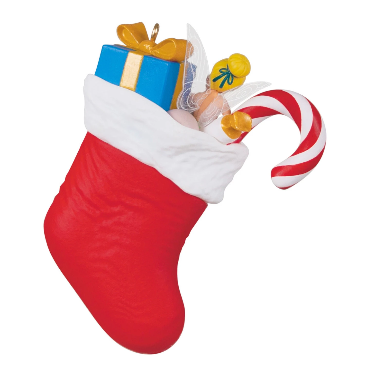 Nestled inside a festive red and white stocking, Tinker Bell is ready to spread some Christmas cheer. This adorable pixie Christmas tree ornament features the beloved Disney fairy with translucent wings, settled between a candy cane and a wrapped present. Tink fans will be thinking happy thoughts as they hang this ornament with care on their Christmas tree.