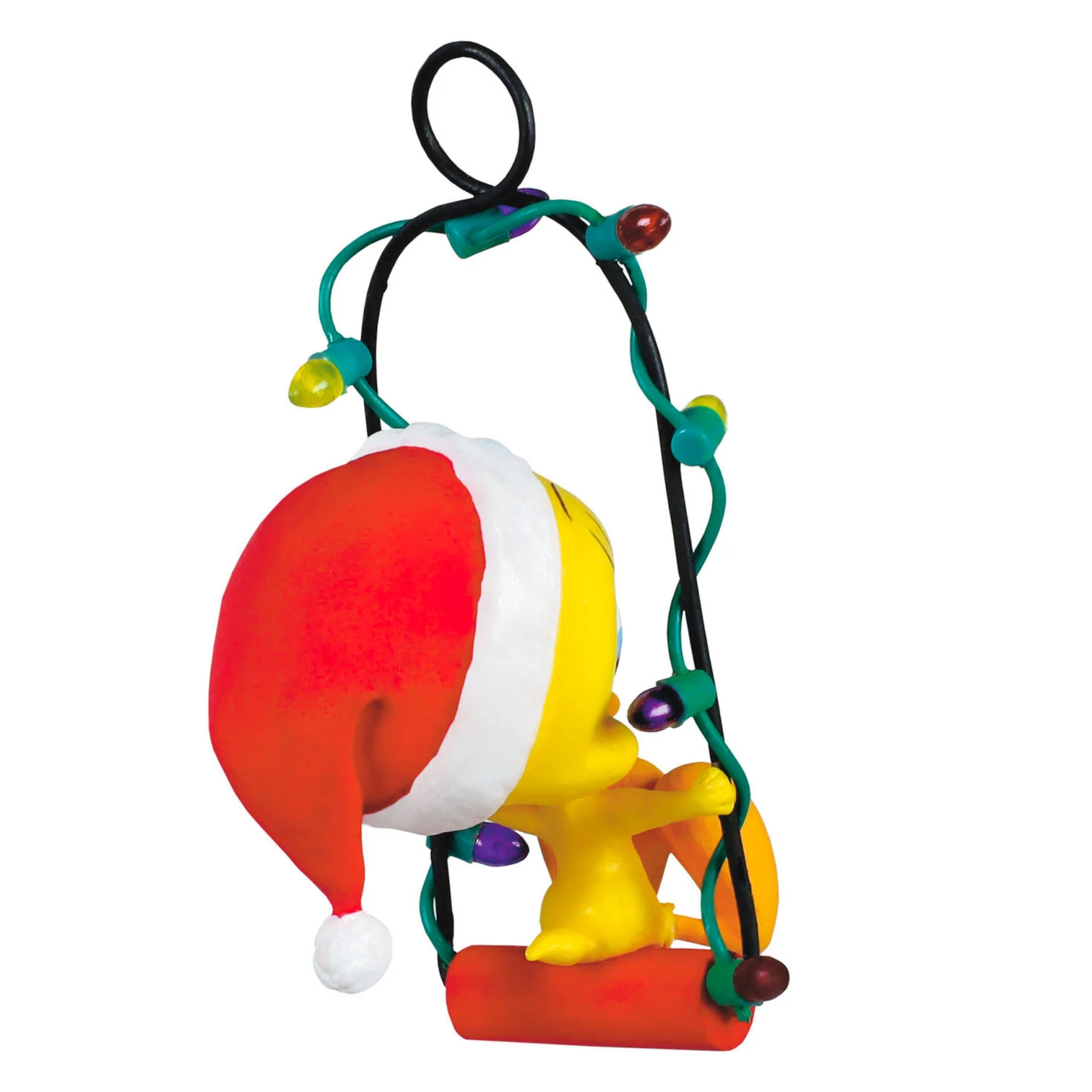 Perched high on the swing in his birdcage, Tweety enjoys a good vantage point to spy a ‘puddy tat’ on the prowl. Get in the holiday spirit with this cute Christmas tree ornament featuring the friendly yellow canary wearing a Santa hat, with a string of Christmas lights decorating his swing. Makes a great gift for Looney Tunes fans of all ages.