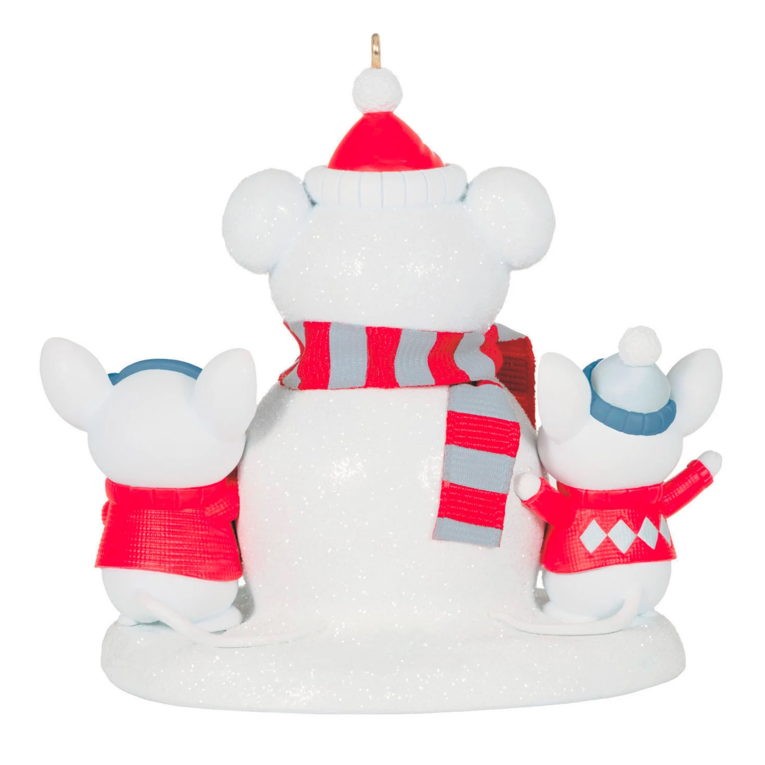 Snow what fun! Bundled up in their festive red sweaters, two merry little mice make the most of a snowy day by building a snowman together. Their cute creation, an oversized snow-mouse, wears a cozy scarf and hat. This charming Christmas tree ornament is perfect for celebrating winter fun and friendship.