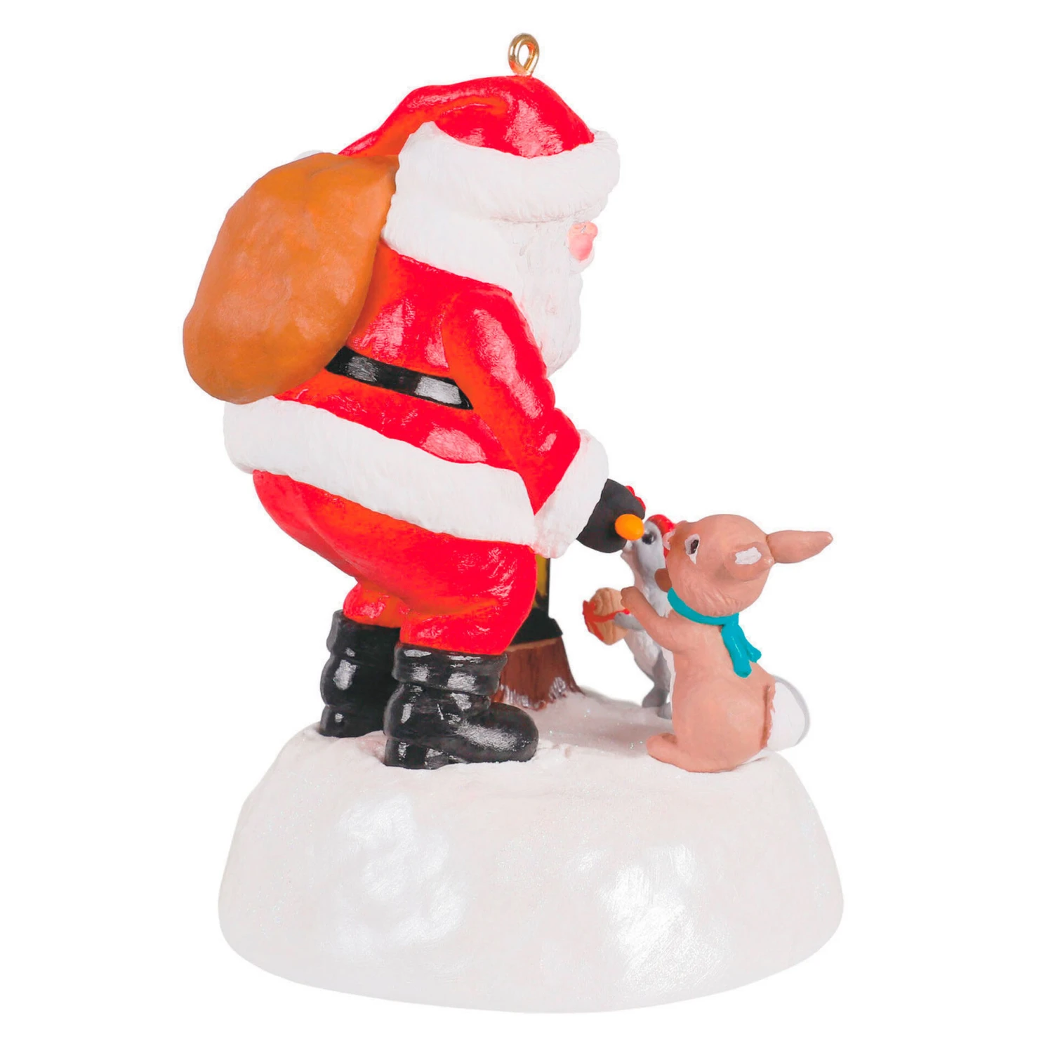 Good little girls and boys aren’t the only ones who get a visit from Santa Claus on Christmas Eve! This sweet Christmas tree ornament features Santa as he greets a bunny rabbit and squirrel with special gifts. Press the button to see the lantern flicker as serene music from “We Wish You a Merry Christmas” plays (battery-operated).