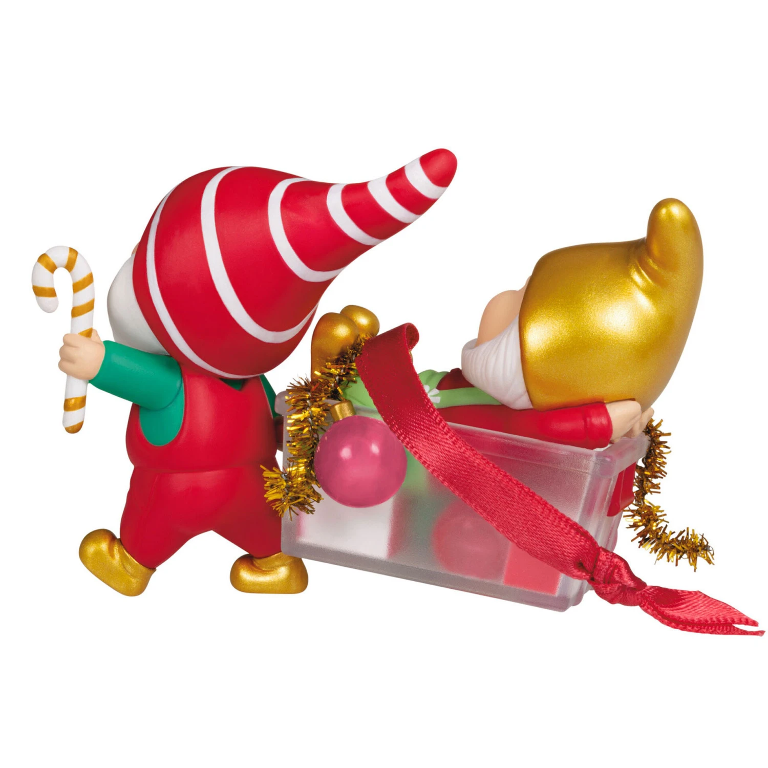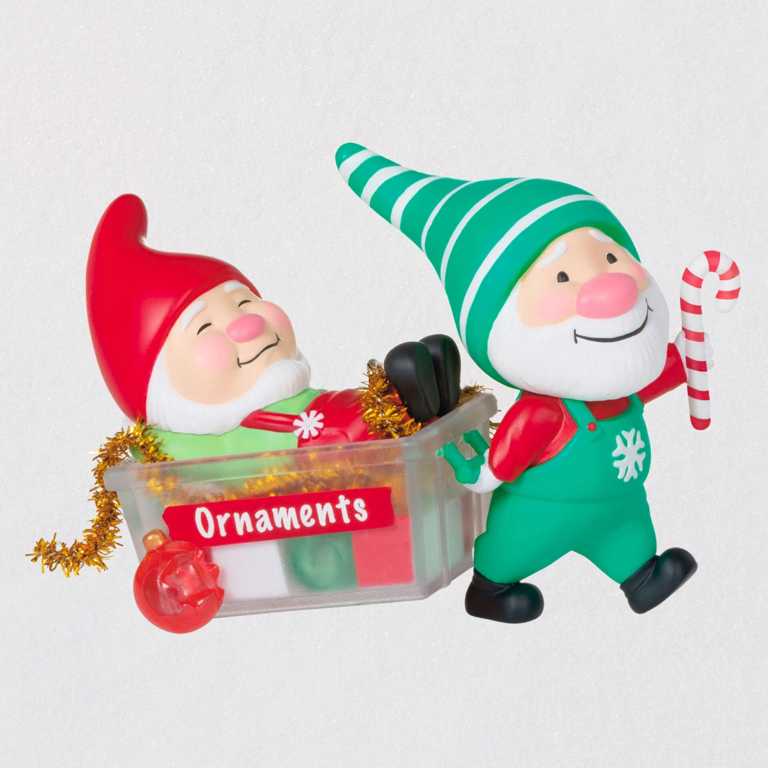 Celebrate 50 years of Hallmark Keepsake Ornaments while you haul in some holiday spirit with a little help from Gnaughty and Gnice, two cute gnomes who are happy to decorate your home with festive fun. This special edition Christmas tree ornament complementing your Gnome for Christmas collection showcases the pair’s antics as Gnaughty has fallen asleep in a box of ornaments, and Gnice has started a parade to tow him to the Christmas tree. Coordinating 3rd in series sold separately.