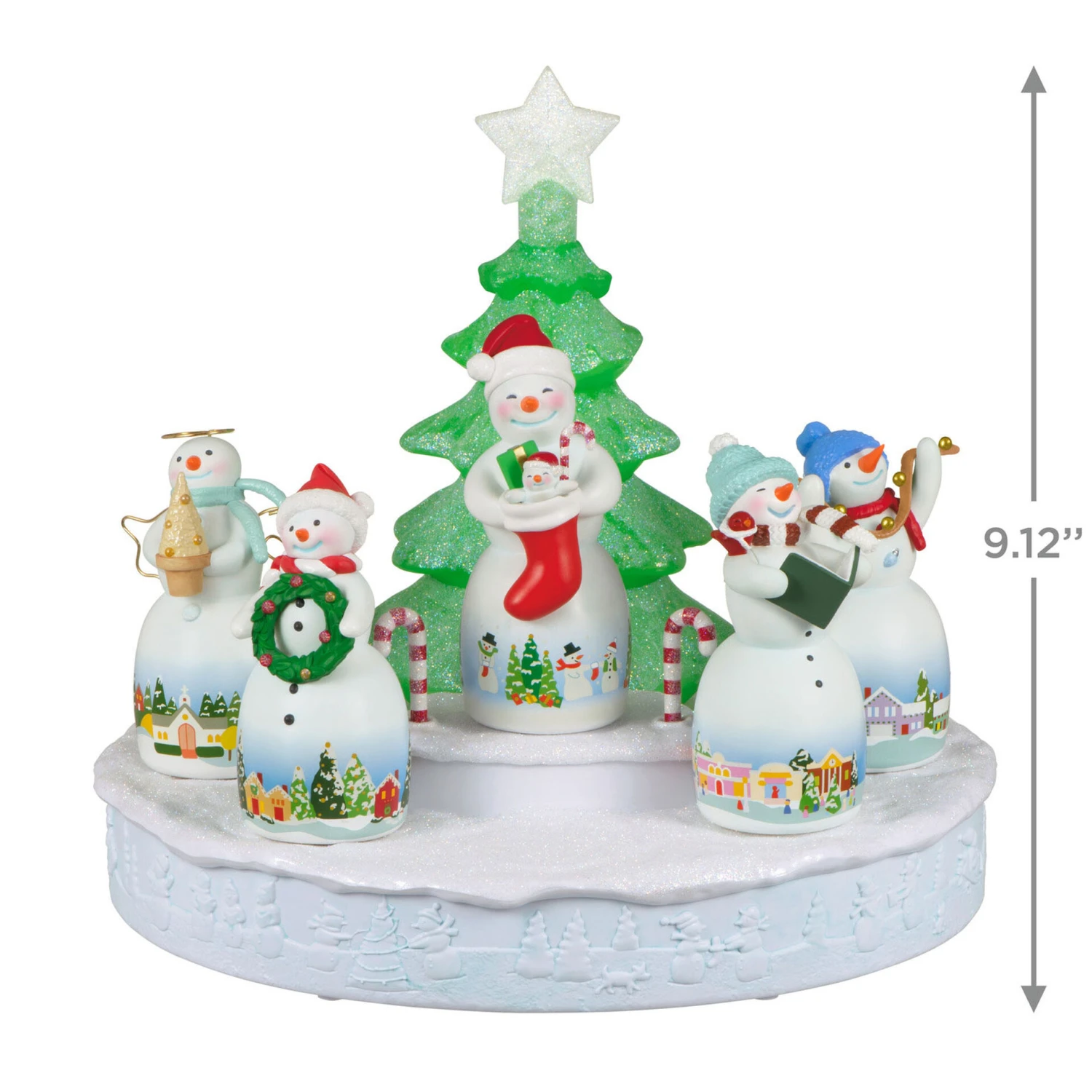 Create a festive, musical winter wonderland in the cozy comfort of your holiday home. Inspired by the Snowtop Lodge Hallmark Keepsake Ornaments created by Hallmark Artist Joanne Wright, this adorable interactive tabletop decoration features five charming snowmen standing in the snow around a sparkling Christmas tree. Connect to the included power adapter to see a continuous light effect. Then place one of the snowmen on the raised platform to hear a holiday song and see a synchronized light show. Plays “We Wish You a Merry Christmas,” “Jingle Bells,” “Hark the Herald Angels Sing,” “Here We Come A-Caroling” and “Jolly Old St. Nicholas.” No batteries necessary.